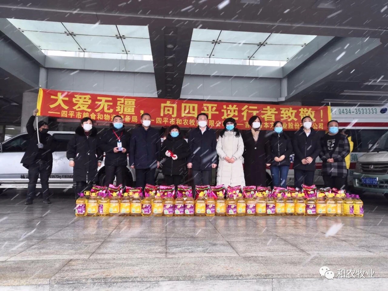 2020年2月28日由四平市糧食和物資儲(chǔ)備局組織,吉林和農(nóng)牧業(yè)集團(tuán)向四平市衛(wèi)健委捐贈(zèng)物資大米、豆油、葵花籽油以及野蠻香黑豬肉健康卡
