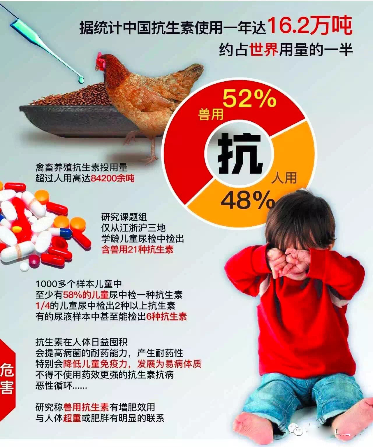 動物飼料添加抗生素能幫助動物預防疾病、促進生長,提高產(chǎn)量。但抗生素用多了,動物耐藥性增強,會出現(xiàn)一些副作用。長期食用“有抗食品”,消費者的耐藥性也會不知不覺增強,等于在人體內(nèi)埋下一顆“隱形炸彈”。